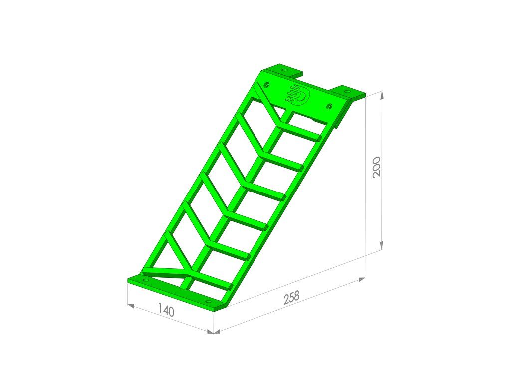 Výška 200 mm a sklon přibližně 38° vytváří strmý výjezd, který prověří trakci, dávkování plynu i stabilitu modelu. Úhel je dostatečně výrazný na to, aby oddělil plynulou jízdu od skutečné techniky.